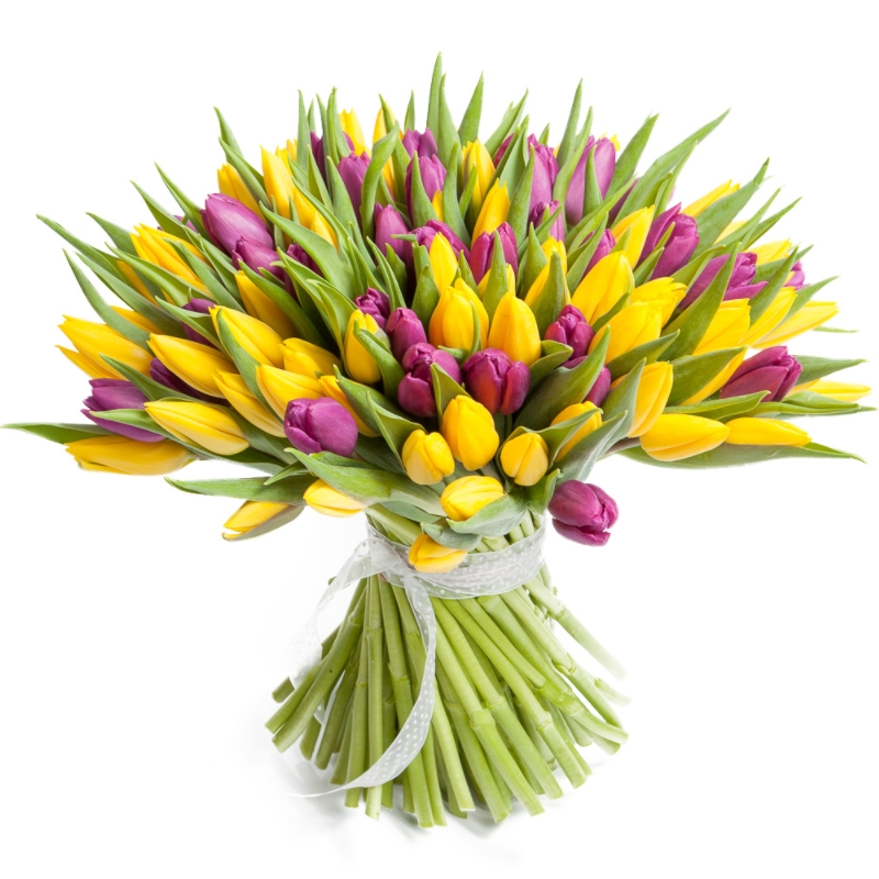 Букет состоит из 51 сиреневый тюльпан, 50 желтых тюльпанов, прозрачная упаковка, атласная лента.