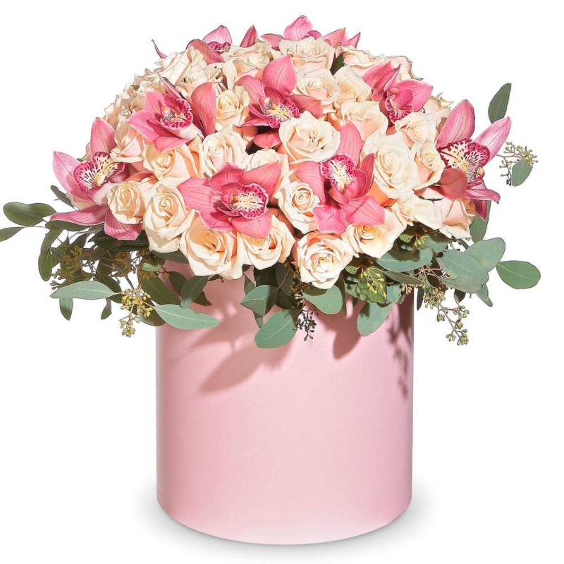 Букет из роз и орхидей в коробке "Кремовый торт"