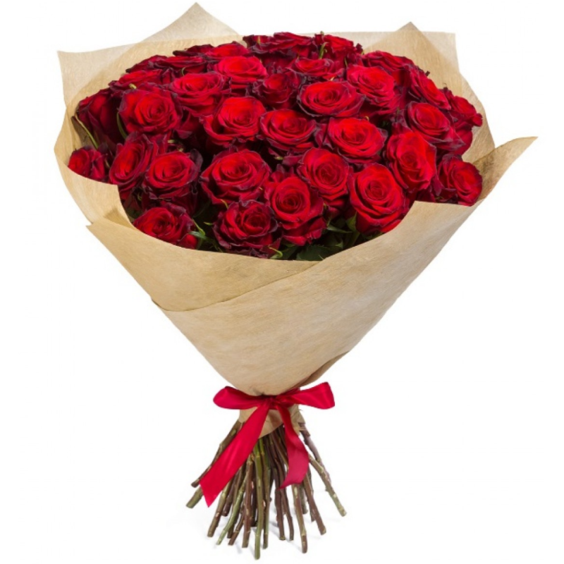 Букет состоит из 45 красных роз, крафт, атласная лента.