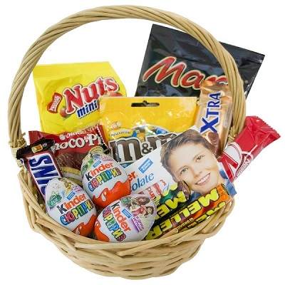 В корзине: Kinder-сюрприз (3 шт.), Kinder Chocolate MAXI молочный, Шоколадный батончик Snickers, Упаковка конфет M&M\'s, Упаковка шоколадных батончиков Nuts, Упаковка шоколадных батончиков Mars 1, Шоколадный батончик Kit-Kat, Шоколадный батончик Mars, Конфеты Meller (2 шт.), Печенье.